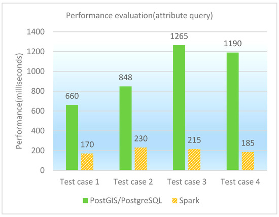 The performance of testing attribute queries under different database platforms is shown in both Table 5 and Figure 5. Because the query performance on ESRI Spatial Framework for Hadoop is much slower than the other two database platforms, we just list the latter two when drawing the performance comparison figure (i.e., Figure 5). It is observed that GeoSpark SQL is better than PostGIS/PostgreSQL and ESRI Spatial Framework for Hadoop in attribute query performance.