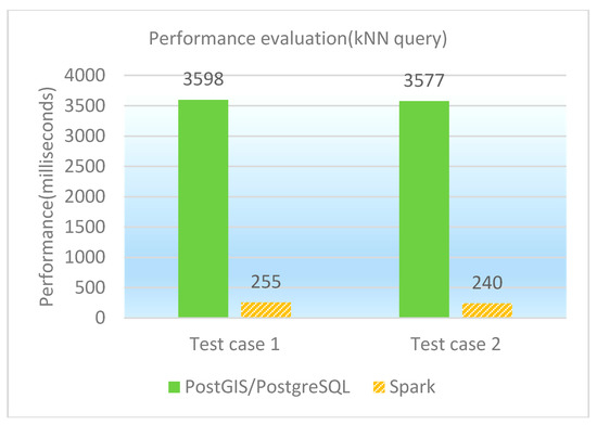 The kNN (k-Nearest Neighbor) query enables finding the nearest k points as well as their attributes from a given point. Two test cases as kNN queries are designed and performed on PostGIS/PostgreSQL, GeoSpark SQL and ESRI Spatial Framework for Hadoop, respectively. The concrete test cases are illustrated in Table 6, and the performance of kNN queries under different database platforms is shown in both Table 7 and Figure 6. It is observed that GeoSpark SQL is much better than PostGIS/PostgreSQL and ESRI Spatial Framework for Hadoop in kNN query performance.