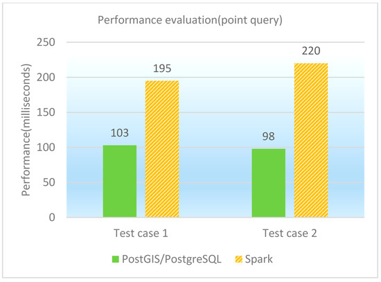 The point query is to find the features that contain the given point. Two test cases as point queries are designed and performed on PostGIS/PostgreSQL, GeoSpark SQL and ESRI Spatial Framework for Hadoop, respectively. The concrete test cases are shown in Table 8, and the performance of point queries under different database platforms is illustrated in both Table 9 and Figure 7. It is observed that PostGIS/PostgreSQL performs better than GeoSpark SQL in point queries. That is because the point query’s selection rate is quite high (e.g., only 1 row is returned for the test cases), which results in a minimization of the calculation cost. PostGIS/PostgreSQL’s spatial index plays a vital role in data filtering, while GeoSpark SQL has additional costs on both network transmission and scheduling.