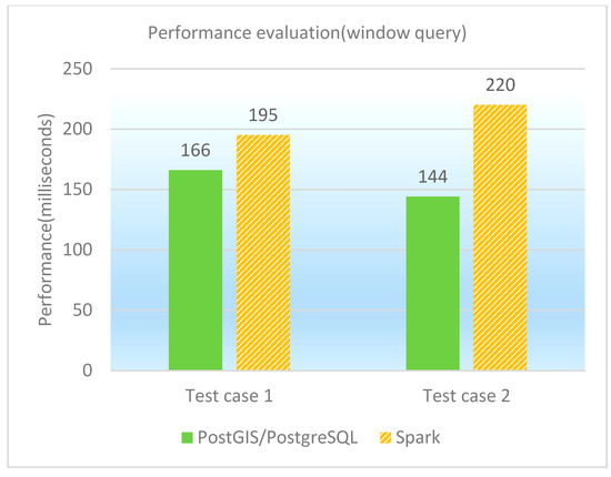 The window query is to find the spatial features that locate in a given rectangle. Two test cases as window queries are designed and performed on PostGIS/PostgreSQL, GeoSpark SQL and ESRI Spatial Framework for Hadoop, respectively. The concrete test cases are shown in Table 10, and the performance of window queries under different database platforms is shown in both Table 11 and Figure 8. It is observed that PostGIS/PostgreSQL performs better than GeoSpark SQL in window queries. The reason is similar to former point queries. When the query’s selection rate is very high, the spatial index plays a vital role and parallelization can only bring the cost of additional network transmission and scheduling, so that GeoSpark SQL is not as good as PostGIS/PostgreSQL in the two test cases.