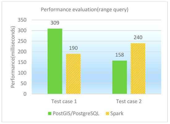 The range query is to find the spatial features that locate in a given polygon range. Two test cases as range queries are designed and performed on PostGIS/PostgreSQL, GeoSpark SQL and ESRI Spatial Framework for Hadoop, respectively. The concrete test cases are shown in Table 12, and the performance of range queries under different database platforms is shown in both Table 13 and Figure 9. It is observed that GeoSpark SQL and PostGIS/PostgreSQL are generally close in range query performance. The computational complexity of test case 1 that queries the polygon-type table is higher than that of test case 2, which queries the point-type table. As for test case 1, GeoSpark SQL performs better; while as for test case 2, PostGIS/PostgreSQL performs better. This also means that GeoSpark SQL is more sensitive to compute-intensive spatial queries. In addition, we notice that Spark is not a panacea. The traditional spatial database performs better than GeoSpark SQL in some scenarios, especially for the spatial queries with high selectivity.