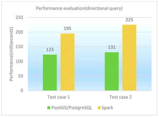 The directional query is to find the spatial features that are on top of/under/on the left side of/on the right side of a given feature. Two test cases as directional queries are designed and performed on PostGIS/PostgreSQL, GeoSpark SQL and ESRI Spatial Framework for Hadoop, respectively. The concrete test cases are shown in Table 14, and the performance of directional queries under different database platforms is shown in both Table 15 and Figure 10. It is observed that PostGIS/PostgreSQL performs better than GeoSpark SQL in directional queries. The reason is similar to former point and window queries.