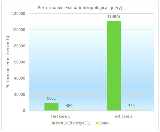 The topological query is to find the spatial features that have a specific topological relationship with the given feature. Two test cases as topological queries are designed and performed on PostGIS/PostgreSQL, GeoSpark SQL and ESRI Spatial Framework for Hadoop, respectively. The concrete test cases are illustrated in Table 16, and the performance of topological queries under different database platforms is shown in both Table 17 and Figure 11. It is observed that GeoSpark SQL performs much better than PostGIS/PostgreSQL in the test cases. Because the topological query is compute-intensive and more suitable for parallelization, GeoSpark SQL achieves an outstanding performance. However, PostGIS/PostgreSQL cannot take full advantage of the spatial index when dealing with the ‘Disjoint’ type testing queries, so there is a significant reduction in query efficiency.