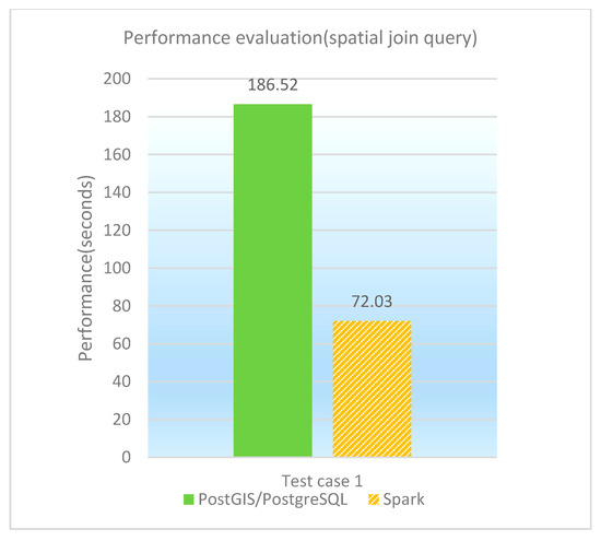 The spatial join query involves with multi-tables, and is the most time-consuming for all spatial queries. A testing query is designed and performed on PostGIS/PostgreSQL and GeoSpark SQL, respectively. ESRI Spatial Framework for Hadoop does not support non-equivalent JOIN statements, so spatial join queries cannot be executed on that platform. The concrete test case is shown in Table 18, and the performance of spatial join queries under different database platforms is illustrated in both Table 19 and Figure 12. It is observed that GeoSpark SQL performs much better than PostGIS/PostgreSQL in the spatial join query, which benefits from Spark’s high performance computing advantages.