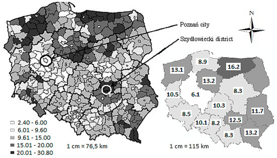 The level of unemployment in Poland has shown considerable spatial (local and regional) diversification. In 2015, the difference between districts (LAU1), characterised by the highest (the Szydlowiecki district: 30.8%) and lowest (the town of Poznan with district rights: 2.4%) unemployment levels, was as large as 28.4 percentage points. At the voivodeship level, the difference was 10.1 percentage points (between Warminsko-Mazurskie voivodeship with 16.2% and Wielkopolskie with 6.1%).