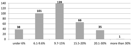 Figure 3 shows the results of grouping districts according to unemployment rates. Unemployment rates below the national mean (9.7%) were observed in 139 districts, mainly in towns with district rights. Values fluctuated around the natural rate of unemployment (below 6%) in 38 districts (which represents 10% of all analysed units). The biggest group consists of districts where the variable ranged from 9.7% to 15%, representing 139 spatial units. Unemployment rates above 20% are observed in as many as 36 districts. In one of these, the rate exceeded 30%.