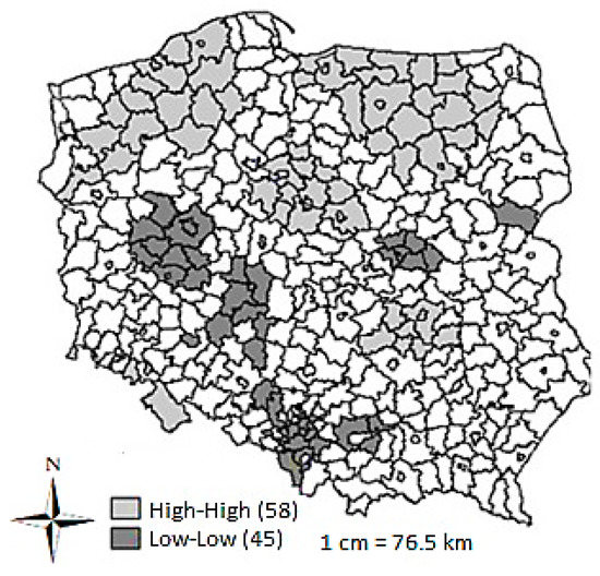 The local Moran’s statistic answers the question as to where exactly in the analysed area this phenomenon arose. In Figure 4, the areas coloured grey indicate clusters of districts characterised by similarly high unemployment rates. It is clearly visible that they are located in the northern part of the country (Zachodniopomorskie, Warminsko-Mazurskie and Kujawsko-Pomorskie voivodeships). In turn, the black areas denote clusters of spatial units with similarly low unemployment rates. They are located in cities: Poznan (Wielkopolskie voivodeship), Warsaw (Mazowieckie voivodeship) and Katowice (Slaskie voivodeship). Statistically non-significant results were obtained for the other districts (i.e., there are no spatial relationships).