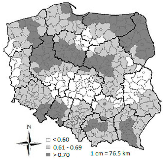 Figure 5 presents the values for the adjusted coefficients of the determination for specific GWR model locations. The map shows that the model has a poor fit with data for districts located in the central and eastern central parts of the country, particularly in the Lodzkie (e.g., the sieradzki district, adjusted R2 = 10%), Lubelskie and Wielkopolskie voivodeships. The model accurately describes the studied phenomenon in the northwestern and northern part of the country, in the districts located in the Warminsko-Mazurskie (e.g., bartoszycki district R2 = 79%), Podlaskie, Wielkopolskie, Kujawsko-Pomorskie and Mazowieckie voivodeships. The map clearly indicates that the model properly describes the studied phenomenon for a majority of spatial units.