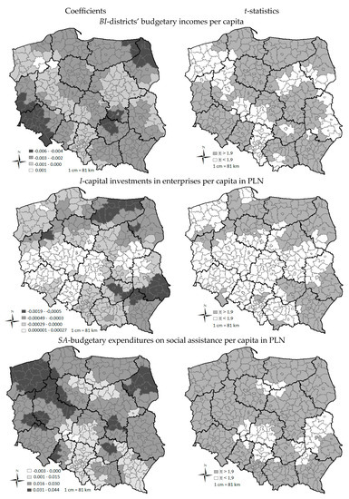 Figure 6 shows local values for the regression coefficients and the statistical significance (Student’s t statistics) of the obtained results. The maps presenting significance figures clearly show that parameters were not statistically significant for each location. This is yet further proof of the diversity of the relationships among the variables within the geographic space. The variables did not necessarily affect the unemployment rate nationwide. There were clusters of districts in the geographical space for which the parameters were statistically significant. The maps showing the parameters’ values reveal that the variables affected one another with varying intensity in the different districts. The phenomenon of clustering coefficients of similar values in the geographical space also occurred in that case. Thus, the determinants of the unemployment rate were diverse throughout the country. This diversification, however, was not consistent with the regional division (NUTS 2). The administrative boundaries of the voivodeships did not have a strong influence on this phenomenon.