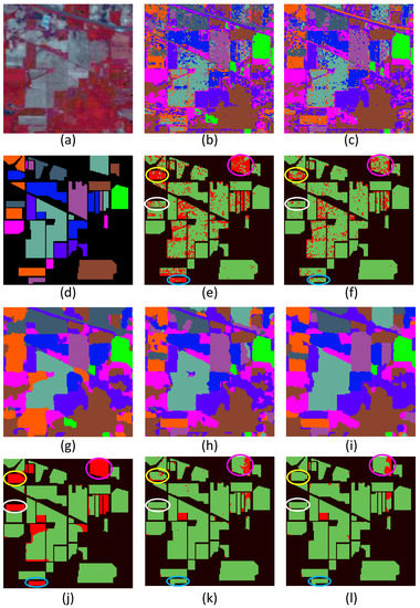 Classification results of the Indian Pines dataset (with 200 training samples for each class). (a) Three-band false color image. (d) Ground truth. (b,c,g–i) Classification maps obtained by multinomial logistic regression (MLR), support vector machines (SVMs), conditional random fields (CRFs), support vector random fields with a Mahalanobis distance boundary constraint (SVRFMC), and higher order support vector random fields (HSVRFs). (e,f,j–l) The corresponding difference images of (b,c,g–i) compared with the ground truth in (d). Black regions represent pixels without ground truth; In the rest of the areas, green regions represent correctly classified pixels and red regions represent wrongly classified pixels.