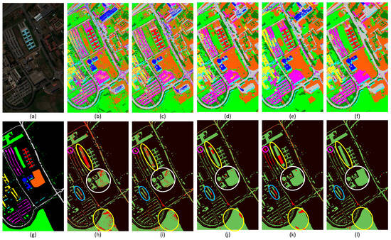 Classification results of Pavia University dataset. (a) Three-band false color image. (g) Ground truth. (g,f) Classification maps obtained by MLR, SVMs, CRFs, SVRFMC, and HSVRFs. (h–l) The corresponding difference images of (b–f) compared with the ground truth in (g). Black regions represent pixels without ground truth. In the remaining part, green regions represent correctly classified pixels and red regions represent wrongly classified pixels.