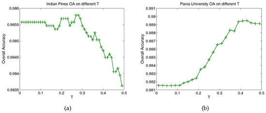 Overall classification accuracies for different values of T. (a,b) show the OA versus different values of T on the Indian Pines and Pavia University datasets, respectively.