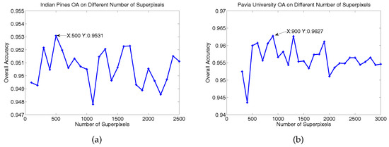 Overall classification accuracies for different numbers of superpixels. (a,b) show the OA versus different numbers of superpixels on the Indian Pines and Pavia University datasets, respectively.
