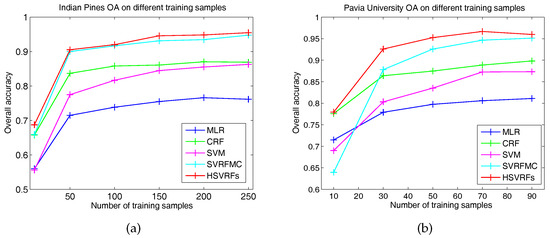 Figure 5 gives the OA curves of MLR, CRF, SVM, SVRFMC, and HSVRFs in relation to different numbers of training samples. Each OA reported the 5-time average overall accuracy. All the other parameters were set the same as those mentioned in Section 3.1. For the Indian Pines dataset, the number of training samples varied from 10 to 250, with a stepsize of 50 except for the first and second point in the curves. For the Pavia University dataset, the number of training samples varied from 10 to 90, with a stepsize of 20. We note that on the two datasets, the OAs of the compared methods grew with the increase in training samples, but the growth became slower when the numbers of training samples increased to a certain point. The HSVRFs model performed the best among the five methods on the two datasets. Lastly, the HSVRFs model obtained the highest OA when the number of training samples was 200 for the Indian Pines dataset and 70 for the Pavia University dataset, which was reported in Section 3.1.