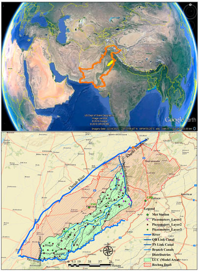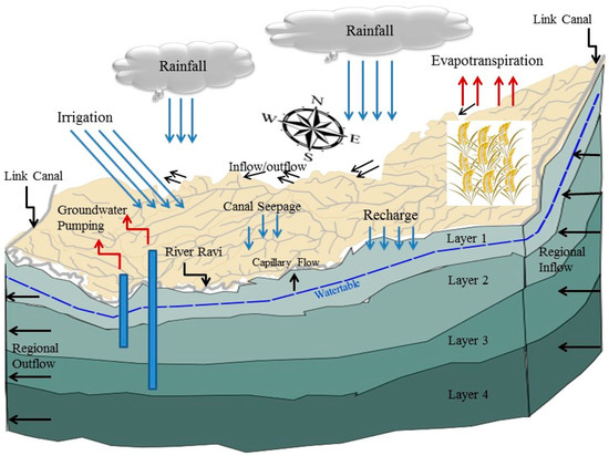 Figure 2 represents the conceptual model of the irrigation system in LCC. The model region is bound by two link canals on the eastern and western sides and along most of the southern side by river Ravi. The water flow from river Chenab to river Ravi is perennial as water rights of river Ravi are possessed by India under the Indus Water Treaty signed between the two countries in 1960. Therefore the river Ravi cannot cater the irrigation needs of the region alone. The northern boundary of the model domain acts like inflow/outflow at different sections, and the lateral flows were estimated by Darcy’s law using piezometric data [34]. Overall, the groundwater flow is parallel to this model boundary from north-east to south-west direction.