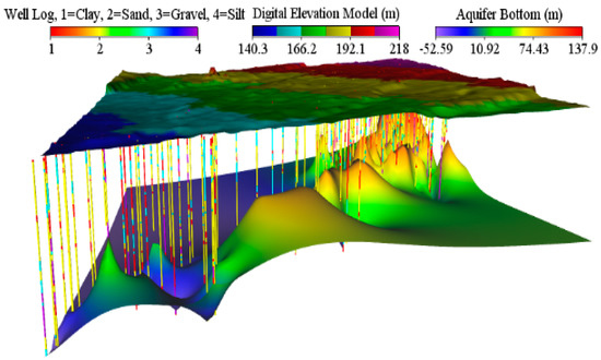 The study area is a part of an abandoned floodplain. The deeper part is formed by the underlying metamorphic and igneous rocks of Precambrian age. The area is underlain by highly stratified unconsolidated alluvial material composed of sands of various grades interbedded with discontinuous lenses of silt, clay and nodules of kanker, a calcium carbonate structure of secondary origin deposited by present and ancestral tributaries of the Indus River [4]. This forms the only one continuously interconnected aquifer and sediments at top mainly comprise of medium to fine sand, silt and clay. Overall, high percentage of silt and fine to very fine sand is dominant in the area with clay dominant in some depressions [35]. The origins of clay have not been identified specifically, but they are presumed to be the repeatedly reworked loess deposits of the hills at the north and northwest. Hydrogeological investigations in Rechna Doab were carried out during the 1957–1960 period wherein test holes were drilled throughout the Doab. The maximum thickness of alluvium is not accurately known although the logs of test wells show that thickness is over 150 m nearly everywhere (Figure 3).
