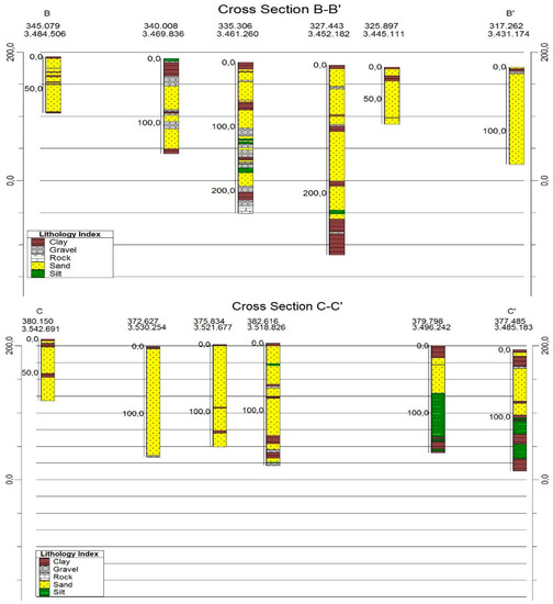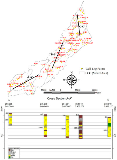 Figure 3 illustrates the location of well-logs in LCC, while Figure 3 indicates lithological details of selected well-logs at different locations, according to which the thickness of the alluvium complex is relatively higher in the lower LCC parts compared to upper parts. It can also be seen that the aquifer is mainly composed of sand with deposits of clay, gravel and silt at different depths with no typical pattern in the arrangement of these materials. The aquifer material is highly porous and is capable of readily storing and transmitting water. The horizontal permeability is an order of magnitude larger than the vertical [36]. The total porosity of the water-bearing material ranges from 35% to 45% with an average specific yield of around 14%. The results of pumping tests and the lithological and mechanical analyses of test holes are presented by [37], according to which hydraulic conductivity varies from 24 m/day to 264 m/day and specific yield values vary from 1% to 33% in Rechna Doab.