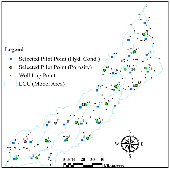 Location of selected pilot points at different locations of LCC. Please note different locations of pilot points for hydraulic conductivity and effective porosity in a given layer but similar for each model layer.