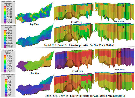 Representation of initial parameter values for hydraulic conductivity (top) and effective porosity (bottom) for automated Pilot Point and manual Zone-Based models for different model views.