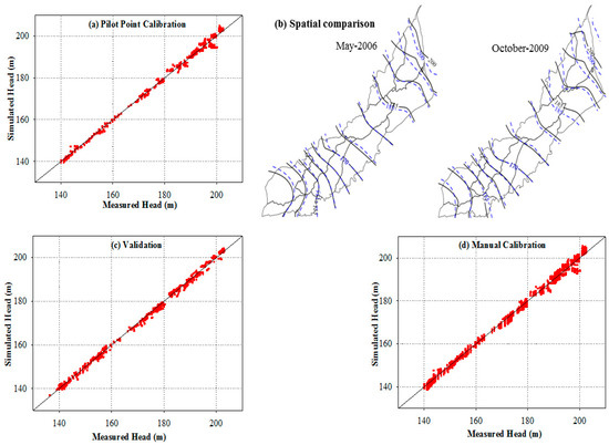 (a) Scatter plot for automated pilot point calibration; (b) spatial comparison between simulated and measured heads (layer 1); (c) validation; and (d) manual PP calibration.