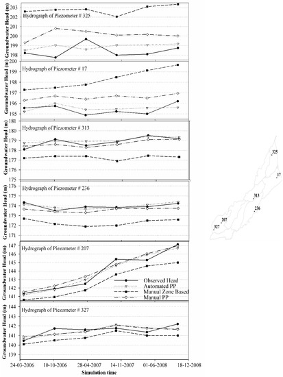 The calibration at model locations near to the river (i.e., piezometer #236, Figure 9) was difficult by the manual zone-based approach but better calibration results were achieved by the PP techniques. It is reported by [34] that the current study area receives its major recharge during summer seasons due to more monsoon rainfalls. In winter seasons, both rainfall and canal flow decrease yielding low recharge in major parts of LCC. This phenomenon is well represented by the trend lines of measured heads which show an increase in height after summer seasons and falling trends after winter seasons. Both of the PP calibration methods (i.e., manual and automated) depicted this increasing/decreasing trends in groundwater heads but they were found missing in case of manual zone-based calibration approach. The difference between automated and manual PP calibration techniques is observed relatively less in the lower to middle reaches of the modelling domain.