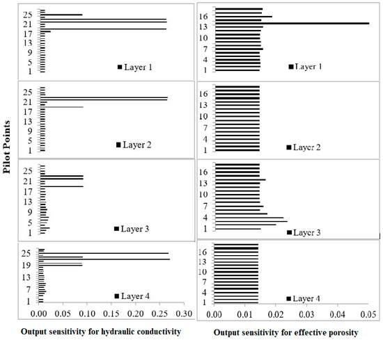 The sensitivities of all PP in different model layers were estimated for all calibration parameters (i.e., Hydraulic conductivity and effective porosity). However, Figure 10 shows only the results for selected pilot points to facilitate visibility and representation of the results. However, the complete results are submitted as a supplemental material in Table S2 and Figure S2. Overall, the sensitivity with respect to hydraulic conductivity is higher than for effective porosity. The sensitivity of model output to model parameters is found higher in most of the north-eastern parts in comparison to other model regions. It is even higher in 1st and 4th layer of the model domain. For PPs in south-west and south-east model regions (refer to Figure 5), the sensitivity with respect to hydraulic conductivity is higher for 3rd and 4th model layer. In case of effective porosity, there is no significant variation in sensitivity for different regions of the model domain, especially for 2nd and 4th model layer. Nevertheless, sensitivity is relatively higher for north-eastern model regions in the 1st model layer and for south-western and south-eastern regions of the 4th model layer. The spatial information of sensitivity of model output could be useful for a further decision about conducting data collection campaigns and to investigate impacts of abstraction in these areas [18]. It might also be an indication of problems with the model setup for such areas if parameter values have reached their upper bounds. Nevertheless, this is not a case for the current modelling setup.