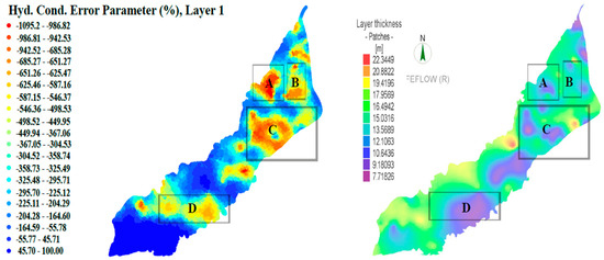 It is also imperative to investigate the sensitivity results in accordance with parameter error results as the understanding of parameter influence is also critical to identify which parameters are not well defined by the observation data and user knowledge input to PEST [18]. Such analysis can help the modeller to identify regions where current field information is not sufficient and where future data assessments should be taken place in order to have better data. The parameter error is calculated as the difference between initial and optimized parameter values divided by the initial parameter value. For the current modelling problem, parameter error for hydraulic conductivity and effective porosity were estimated for all model layers which are provided as supplemental material in Table S2. Figure 11 shows the parameter error only for the selected layer. The evaluation for hydraulic conductivity showed that both sensitivity and parameter error is found higher in model layers 1 and 2 for pilot points in regions A, B and C (Figure 12 for parameter error of hydraulic conductivity in the first model layer). When this information is incorporated into model layer thickness then it is helpful in planning further field investigations (e.g., preferred pumping test site, drilled well logs etc.). Figure 11 is also marked with another region “D” where the parameter error is high but the sensitivity of current model output is low. This suggests that, as the model is not very sensitive to parameter values changes in such regions, therefore, there is very less potential for improvement in model results with further field investigations. Contrary to this, there are some regions in the 4th layer (upper model locations) where model sensitivity is quite high but in this case, the parameter error is low. This also guides researchers to expect less improvement in current modelling results with further field investigations at such locations. The other case is about moderate values of parameter error and model sensitivity for model layers 3 and 4. In such cases, improvement in the modelling results is possible but the decision about further field data collection is all about the purpose for which the model is constructed and of course on the availability of sufficient funds for fieldwork.