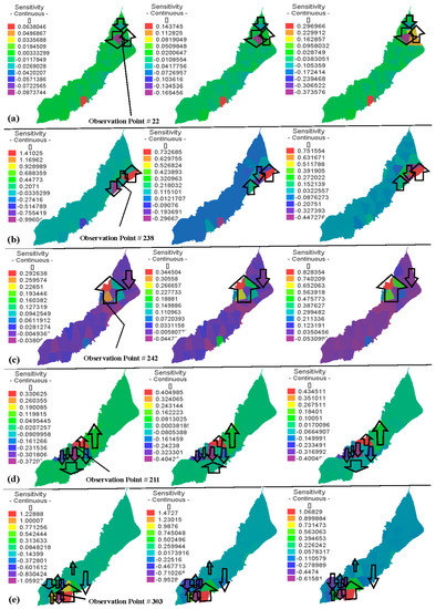 For instance, Figure 12a shows the sensitivity for observation point 22, which depicts that major regions of the model domain are not very sensitive to hydraulic head at this point but there are fragmented locations which show strong sensitivity either positive or negative at this observation point at all three different simulation times. Similarly, sensitivity distribution for observation point 242 can be observed from Figure 12c. This shows a very clear trend of sensitivity distribution as the majority of the model parts upstream of this location show positive sensitivity. It means if any hydraulic activity is to be performed at/near to this point; it must contain very good data about hydraulic properties in high sensitivity zones. The sensitivity distribution for observation point 211 (Figure 12d) has very clear information as two different behaviours of sensitivity can be observed both upstream and downstream of this location. Majority of the nearby downstream locations exhibit very high negative sensitivity and the majority of upstream location have weak to average positive sensitivity. This suggests that downstream areas need to be properly investigated for hydraulic properties if any hydraulic activity is to be planned at this location. The sensitivity distribution for observation point 238 does not show consistent results for all simulation times which means that flow trends at this location are variable from time to time and such locations can be identified by opposite arrow directions in Figure 12b. For such locations, the information of observation sensitivity is not very useful. The sensitivity distribution and demarcation of important location for each particular region for rest of the selected observation points can be seen from Figure 12. Moreover, the sensitivity in the south-east of model domain away from points 22, 238 and 242 could be associated to numerical artifact.