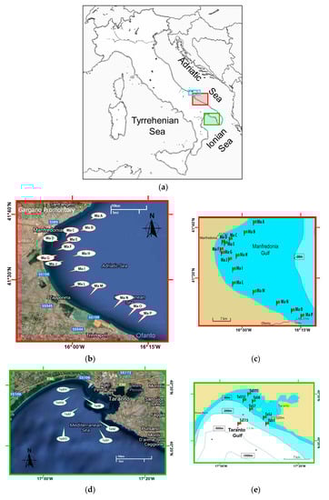 The study area comprised three sections of Italian coastal waters (Figure 1a): the Manfredonia Gulf, Taranto Gulf, and the area close to Lesina Lagoon [].