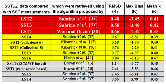 The comparison with the SSTskin evaluated from in situ data highlighted that the algorithm for retrieving LST data from MODIS images proposed by Sobrino et al. [] and the current operative algorithm for retrieving LST data from MODIS images proposed by Wan and Dozier [] both minimized the error in the SST measurements of these coastal waters with respect to the current operative algorithm for retrieving global data of SST from MODIS images proposed by Kilpatrick et al. [].