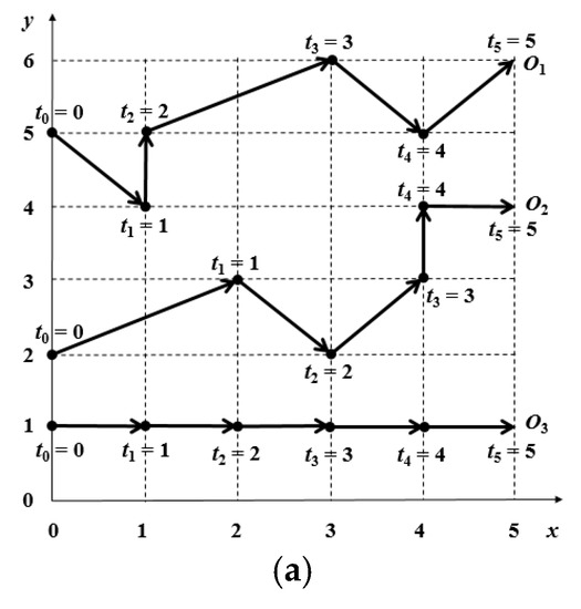 A MTSSTN is generated based on a corresponding interaction pattern. The generation of a MTSSTN includes three steps: (1) the generation of the vertices of the sub-networks during the time intervals at multiple temporal scales; (2) the generation of the edges of the sub-networks, and (3) the generation of the MTSSTN. A sample dataset, which is displayed in Figure 4a, is utilized to illustrate how a MTSSTN is generated. In this dataset, three trajectories which are generated by three corresponding objects (i.e., O1, O2 and O3) during five consecutive time intervals at the finest temporal scale are involved. In Figure 4a, the (x, y) positions of each object at each of the six time stamps are given. Hence, the RTC relations of the three objects during the five consecutive time intervals at the finest temporal scale can be derived, which are shown in Figure 4b.