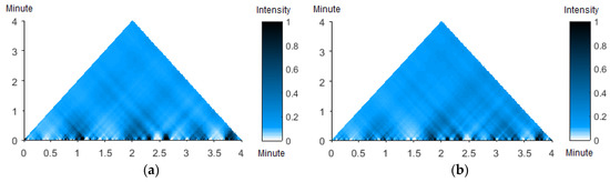 Besides, as introduced in [12], by employing corresponding map algebra operations, additional information can be discovered. In this case, a new CTM diagram is generated by employing the ‘maximum’ operator to the four CTM diagrams displayed in Figure 7. The new CTM diagram is shown in Figure 8, in which each colour corresponds with a specific player. Figure 8 depicts which player had the strongest local interactions during all time intervals. For instance, from Figure 8, we can conclude that player 6 interacted comparatively more intensively with the other three players from the perspective of a long time-interval (e.g., longer than about 2.5 min). When the time intervals were shorter than about 2.5 min, each of the four players had specific time intervals during which he interacted comparatively more intensively with the other three players. This shows that, the proposed approach has potential to help sports professionals (e.g., coaches) to explore the local interactions of a group of target players in order to examine which player had a high influence on the movement patterns of the players around him, thus allowing evaluating player performance.