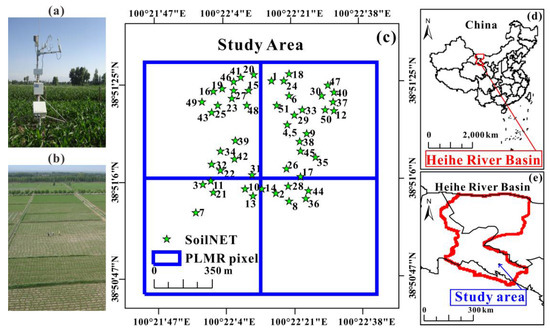 Figure 1. The map of study area with the locations of SoilNET and polarimetric L-band multibeam radiometer (PLMR) products (c). The study area is in Heihe River Basin (e), in the north of China (d). The photos were taken in the Yingke (a) and Daman (b) irrigation districts and are reprinted from Farmland Ecosystem observation site, http://www.chinaflux.org/.