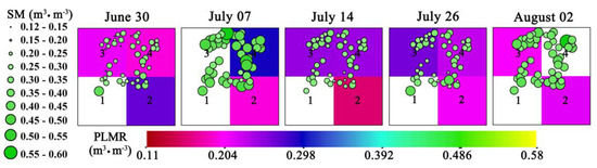 The unstable spatial–temporal heterogeneity in soil moisture will introduce uncertainties into upscaling for validation activities of USME to RS data [27,52,53]. Given the lack of multiresolution RS data, only the plot scale and PLMR products are of the same size, and the PLMR footprint is regarded as one of the target scales in the upscaling process. Thus, the USME at the plot scale (p) is compared with the RS data using the root mean squared error (RMSE) to explore uncertainties in upscaling processes, which is expressed as RMSE ( θ P , θ RS ) [18,20,27].