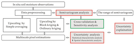 An upscaling method and a data assimilation strategy are necessary to convert multipoint WSN soil moisture observations to a pixel format covering the satellite footprint to eliminate this mismatch. There are four commonly used upscaling methods for in situ observations. The first and the most commonly used approach is the simple averaging of in situ data [21,22]. The second is to introduce a kriging algorithm while considering spatial autocorrelation [23]. The third approach is using distributed land surface modeling to simulate the spatial pattern of soil moisture [24], and the fourth approach is using the apparent-thermal-inertia-based method to derive the soil moisture from fine-resolution satellite thermal signals [19,22]. However, these four methods focus on the upscaling and validation of ISMO to the footprint of just one RS soil moisture product [20,22]. This leads to an obvious question that we want to answer: whether the upscaled results at different resolutions obtained by the same upscaling method are statistically comparable and spatially stable. If the answer is yes, that method will contribute to the data fusion of ISMO with multiresolution RS data as well. In addition, soil moisture is characterized by spatial–temporal heterogeneity, and this heterogeneity will change with the different soil texture, vegetation, topography, and meteorological conditions at different scales, adding uncertainty to the upscaling and validation processes [20,25,26]. How to quantitatively evaluate the scale effects in kriging from the perspective of spatial heterogeneity is another important question that we want to answer in this paper. Some researchers have realized the question and have done some simple descriptions in their works [27,28].
