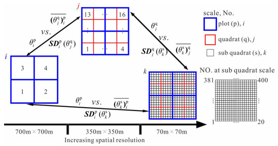 where S D i LS ( θ j SS ) denotes the calculated deviations of the SS pixels USME within the LS pixel i , θ j SS denotes the SS pixel j within the LS pixel i , and n is the number of the SS pixels in each LS pixel. The S D i LS ( θ j SS ) within each LS pixel are compared with each other and the differences are ideally small. The smaller the differences of deviations among these LS pixels, the more consistent the scale effects of the different regions. Moreover, if S D i LS ( θ j SS ) is ideally small, it indicates negligible difference between the LS pixel i and the SS pixels within pixel i . In this paper, the LS and SS groups are plot–quadrat, plot–subquadrat and, quad–subquadrat (Figure 4). S D i p ( θ j q ) denotes the calculated deviations of the quadrat pixel USME within the plot pixel i .
