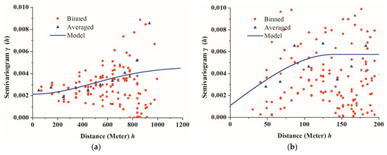 Kriging is based on the theory and structural properties of a semivariogram, and it makes optimal and unbiased estimations for regionalized variables at unsampled locations [28,39]. A semivariogram is the basic of geostatistics, and can quantify the spatial heterogeneity of the regionalized variable, soil moisture Z ( x ) [40,41]. The experimental semivariogram is defined as the following:
