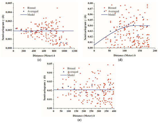 where N ( h ) is the number of pairs of observations separated by distance h . An empirical semivariogram can be approximated by predefined theoretical semivariogram models (e.g., pure nugget effect model, Gaussian model, exponential model, linear model, or spherical model) [19,23]. Three parameters—nugget, sill, and range—are often used to describe semivariograms. The nugget is the discontinuity of the semivariogram at the origin and can be used to judge if uncorrelated noise (measurement error) exists or if the spatial structures are smaller than the pixel size [42]. The sill indicates the spatial variability of the soil moisture [10,43]. The range is the distance at which the semivariogram reaches the sill and the distance beyond which the soil moisture has no spatial dependence [19]. Sometimes, some semivariograms approach their sills asymptotically, and so they have no strict ranges [35]. For practical purposes their effective ranges are usually taken as the lag distances at which they reach 0.95 of their sills. The empirical semivariograms on the five acquisition dates were calculated using ESRI ArcGIS® 10.4 software with the best-fit criterion [29]. The way of choosing between competing semivariogram models is to evaluate their performance in the kriging interpolation [35].