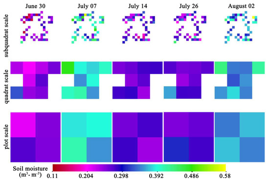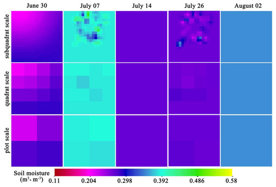 Table 3. Coefficients of variation of upscaled soil moisture estimations at the scale series on five acquisition dates. Sub: subquadrat scale. Quad: quadrat scale. Plot: plot scale.