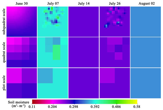 Plots, quadrats, and subquadrats are often regarded as sampling extent indices in agriculture science and ecology [49], and these indices are introduced to represent the scale series. The scale series covers the entire study area (1400 × 1400 m). The plot scale consists of 4 grids of the same size (700 × 700 m), the quadrat scale consists of 16 grids of the same size (350 × 350 m), and the subquadrat scale consists of 400 grids of the same size (70 × 70 m). The plot scale and the PLMR products are of the same size. The length of the subquadrat scale is similar to the average distance between the SoilNET nodes and their nearest neighbors on each date (~70 m).