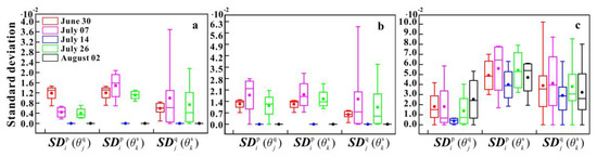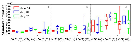 Figure 9. Box plots of the standard deviations based on block kriging (a), ordinary kriging (b), and simple averaging (c) estimations in the smaller scale (SS) pixels within each pixel at the larger scale (LS) on five acquisition days from 30 June to 2 August: SD LS ( θ SS ) (m3·m−3). The box boundaries indicate the 25th and 75th percentiles, the whiskers below and above the box indicate the min and max, the line within the box marks the median, and the point in the box indicates the mean.