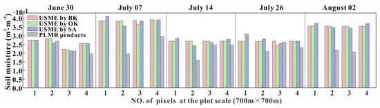 The USME by BK, OK, and SA were relatively most close to the PLMR data on 30 June (Figure 10). The calculated RMSE values based on BK, OK, and SA on 30 June were relatively lower than those on other acquisition days (Table 6). These results indicate that the soil moisture estimations upscaled by BK, OK, or SA to the RS footprints with in situ data were not always similar with the RS data and may not even be able to calibrate them. When the SoilNET soil moisture within the RS footprints was spatially homogeneous (30 June), the differences between RS data and USME were small, and the RS data calibration based on USME was reliable. When the SoilNET soil moisture data had no spatial autocorrelation within the RS footprints (14 July and 2 August), relatively large differences were found between the RS data and the estimations upscaled by BK, OK, or SA. When the SoilNET soil moisture data within the RS footprints was heterogeneous (7 July and 26 July), the RS data calibration based on USME may not be reliable. The RMSE on 26 July was less than 5%, while it was nearly 15% on 7 July.