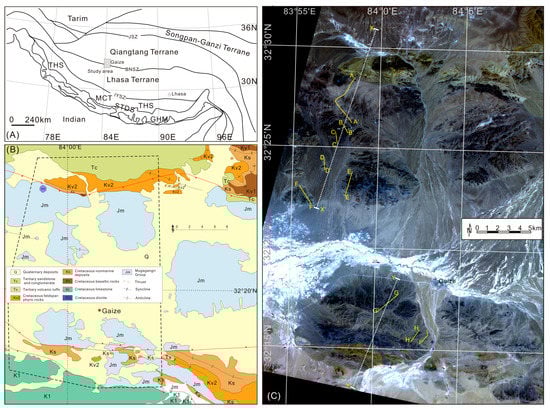 (A) Tectonic map showing terranes and suture zones of the Tibetan plateau (From [7]). The location of the study area is indicated by the dash box; (B) Geological map of the study area, Gaize, Tibet (Modified from [11,16,25]); (C) ASTER false color composite image (Red—band 3; Green—band 2; Blue—band 1) of the study area. Yellow solid lines (e.g., A–A’) indicate field-investigated sections and white dash lines (X–X’ and Y–Y’) indicate composite cross-sections constructed based on the field sections.