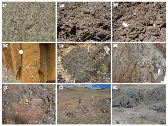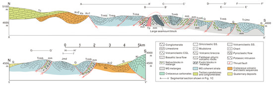 Tectonic mélanges (mm), with typical block-in-matrix fabrics (Figure 6H,I), structurally underlie the sedimentary subunits (Figure 2) [11]. The matrix consists of shaly, sandy and lesser volcanic materials with typical scaly cleavages, whereas the blocks comprise “native” sandstones mainly originated from the MG sediments and “exotic” oceanic crustal or ophiolitic fragments such as basalt and chert, scrapped off the subducting BNO (Figure 6H) [45]. In terms of block lithologies, the mélange appears to be internally stratified: the deeper part is dominated by the oceanic-crustal fragments and the shallower part dominated by components from the MG strata (Figure 2 and Figure 5). During our field study, a large block (>100 m thick across the bedding) was found to be contained within the mélange and show well preserved stratigraphy of cycles of volcanic-sedimentary rocks (Figure 2). The volcanic rocks are basaltic pillow lavas flow and basaltic-andesitic breccias to lapilli-stones, while the sedimentary rocks are dominated by carbonate, chert and volcaniclastic turbidites (Figure 2). We interpreted the large block as scraped-off a subducted seamount [46], the occurrences of which were previously reported from the BNSZ [47,48]. The MG coherent strata and mélanges were deformed into a south-vergent fold-and-thrust system [17].