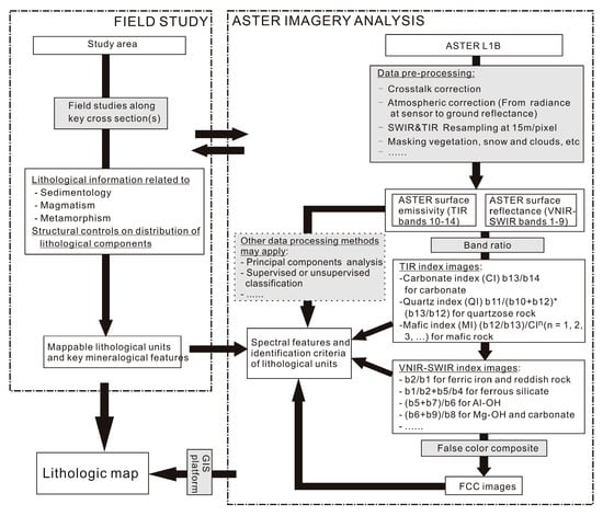 Band ratio was used as a principal data-processing method to highlight the abovementioned spectral signatures of characteristic lithologic compositions (e.g., [6]). The band-ratio images were also classified in terms of index values into color maps for more informative visualizations. In addition, false color composite (FCC) was performed to display grayscale maps into color image and visualize combined spectral signatures. The band-ratio and FCC images, as graphic presentations of diagnostic spectral signatures, were used as base maps for lithologic discrimination and matching, delineation of lithologic boundaries and, finally, the geologic map generation. The generalized procedures of lithologic mapping based on the combined field study and ASTER data analysis are shown in Figure 3. All the data processing procedures were implemented by ENVI software and later visualization, mapping and vectorization were conducted on ARCGIS platform.