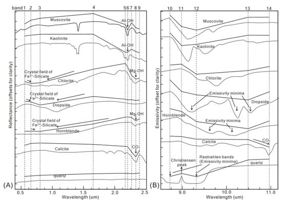 Reflectance (A) and emissivity (B) spectra of key rock-forming minerals. Dash lines show the laboratory spectral data, which are resampled to ASTER bandpass and shown as solid lines. (Modified from [3,34]).