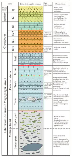 Lithostratigraphic columns of the study area. Internal structure of the Mugagangri Group is revealed: (1) Tectonic mélanges and coherent strata are both essential components; (2) coherent strata are subdivided into four subunits, coded as Trma, Trmb, TrJmc and Jmd; (3) the mélanges are internally stratified with lower part dominated by exotic oceanic materials and upper part by native sedimentary materials. Age data are referred to [11,17]. See text for detailed description.