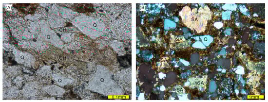 (A) Photomicrograph of a sandstone block from the MG mélange. Note that chlorite (CH) crystallized along boundaries among the quartz grains, possibly replacing matrix or cements. Finer epidote crystals also occur; (B) Photomicrograph of the volcaniclastic sandstone from subunits Trmb. Note that the sample is rich in volcanic clasts that are intensively sericitized. CH—chlorite; SA—sericitized volcanic clast; Q—quartz.