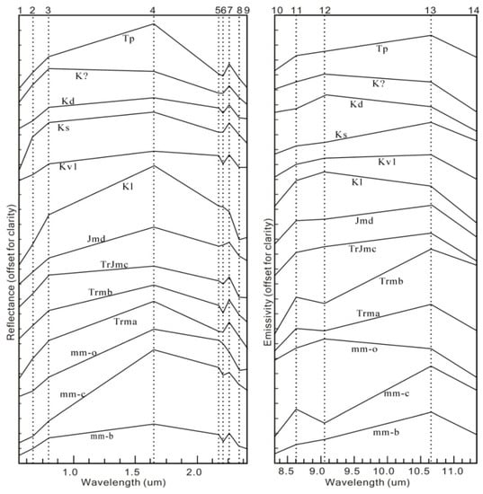 ASTER image spectra of important lithologic units in the study area. Tp—Tertiary potassic intrusive rocks; Kd—Cretaceous diorites; Ks—Cretaceous red beds; Kv1—Cretaceous basaltic rocks; Kl—Cretaceous carbonates. Trma, Trmb, TrJmc and Jmd represent the four subunits of the MG sedimentary successions. Three lithologic types of the MG mélanges (mm): mm-o for components dominated by oceanic basalts, mm-c for components dominated by chert and mm-b for components dominated by sedimentary materials. See text for detailed description of the lithologic units.