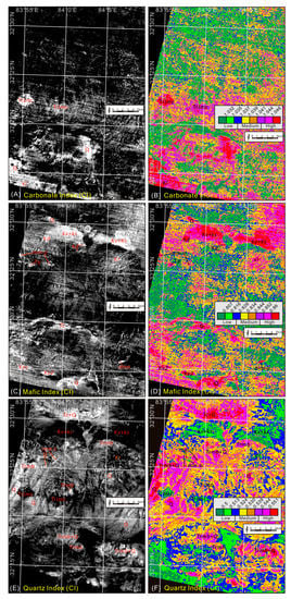 Grayscale and classified color images of the TIR indexes: (A,B) Carbonate index (CI); (C,D) Mafic index (MI4); (E,F) Quartz Index (QI). See text and Figure 8 for interpretation of the labels of lithologic units.